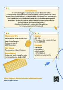 Flyer CompiCamp 2025 zum ausdrucken und weitergeben!Lade den Flyer in A5 Format herunter, drucke in aus und lade deine Freunde ein! Flyer jetzt herunterladen!